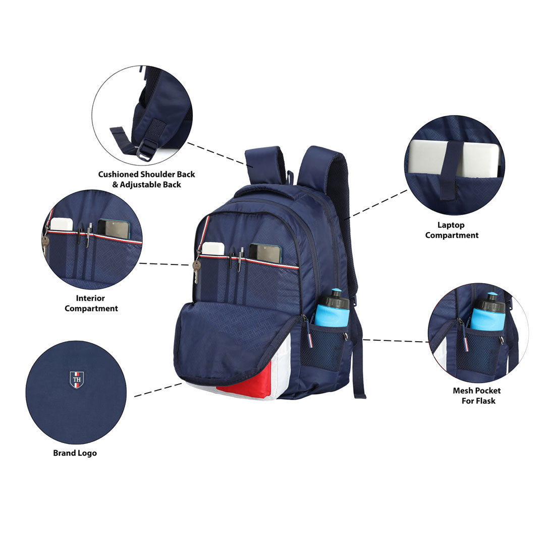 Tommy Hilfiger Rex is a lightweight backpack with a comfortable lumbar support which puts less stress on the carriers back and shoulders. The compartments are spacious and feature multiple small accessible pockets to safe keep all the small essentials. An accessible front pocket makes it more convenient to carry things like charger, passport, pen and ID card. Always keep hydration at hand with the side-mesh pockets designed for water bottles.B