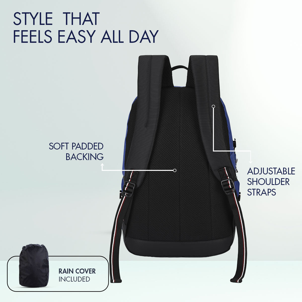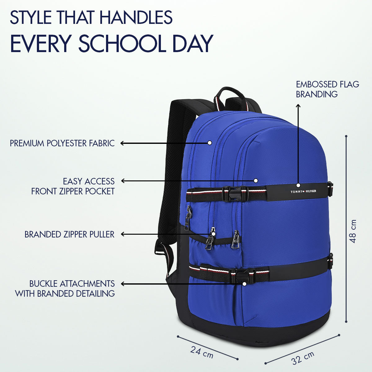 Buckle accents and utility pockets. Adds functionality. Stylish elements. Practical design. Student-friendly.