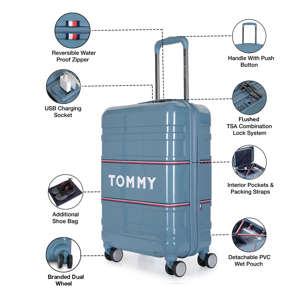 Tommy Hilfiger Wall Street luggage come with an innovative design. The USB charging port makes it a must-have luggage bag. Made from a lightweight and durable material, this bag is easy to carry. The interior is perfect for organizing your essentials and keeping them intact with packaging straps.