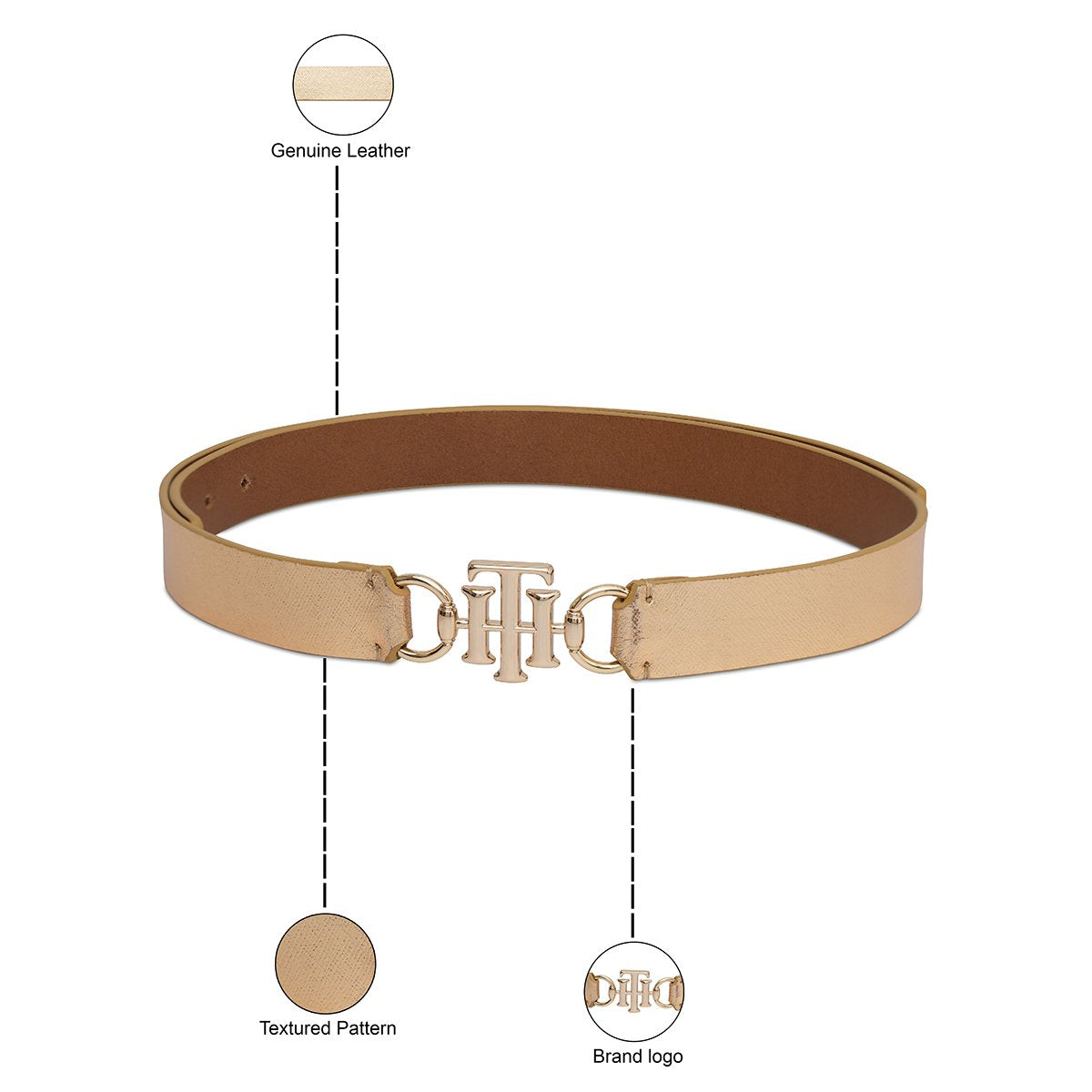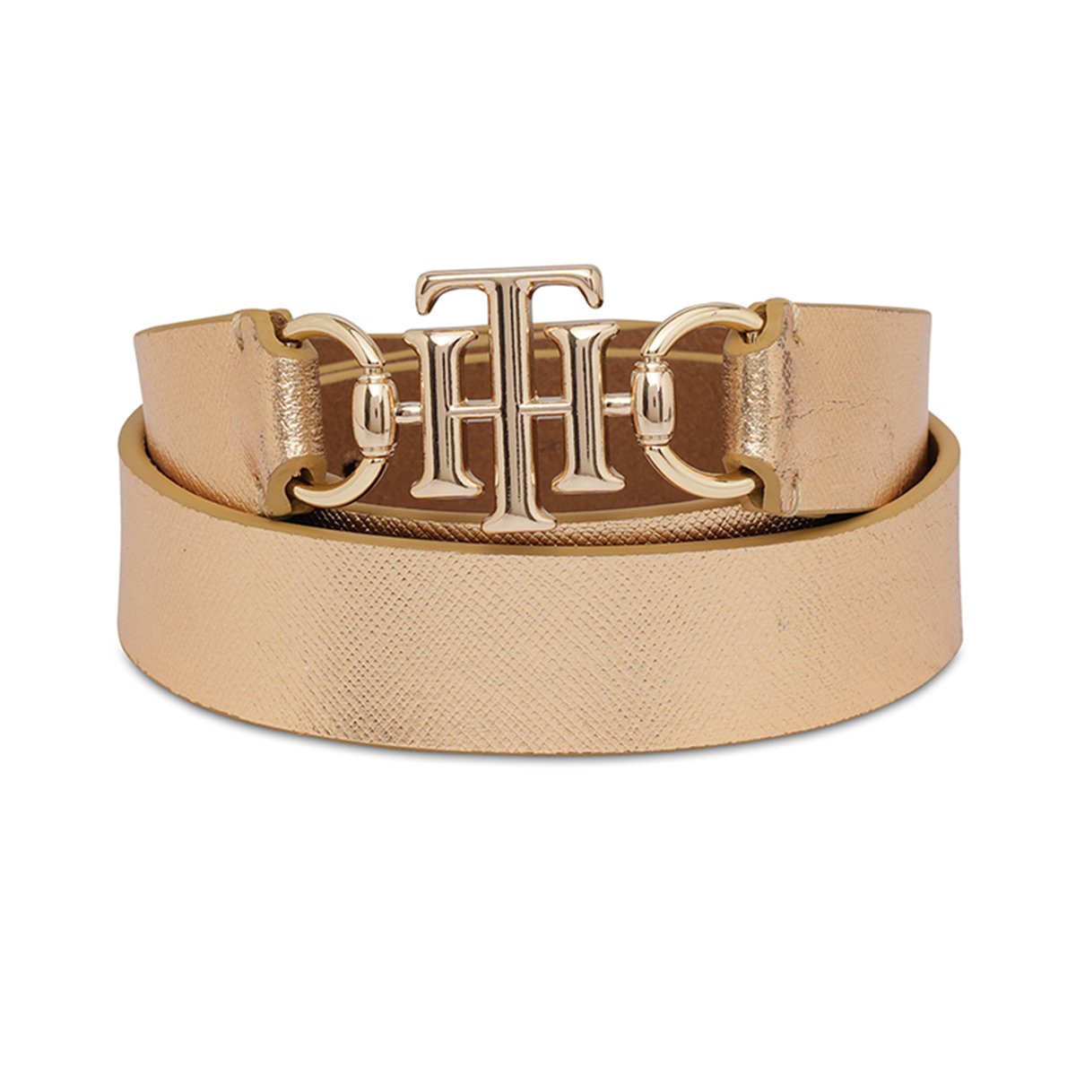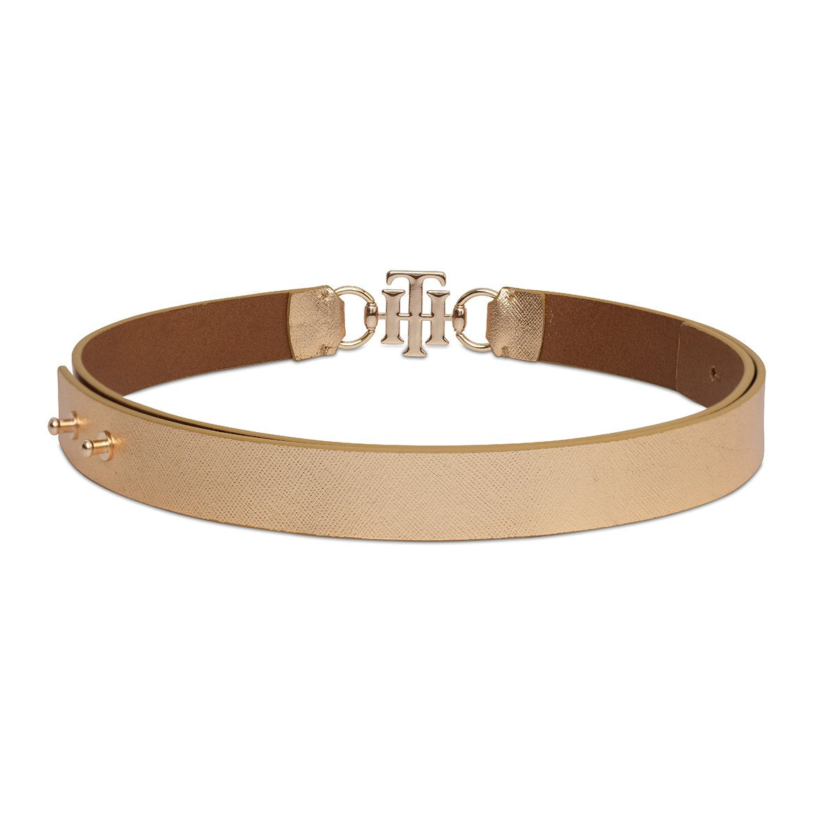 Radiant Texture: The Tommy Hilfiger Yuki Women’s Non Reversible Belt in Metallic Gold is a dazzling accessory. Its textured leather surface catches the light, adding a touch of glamour to any outfit.