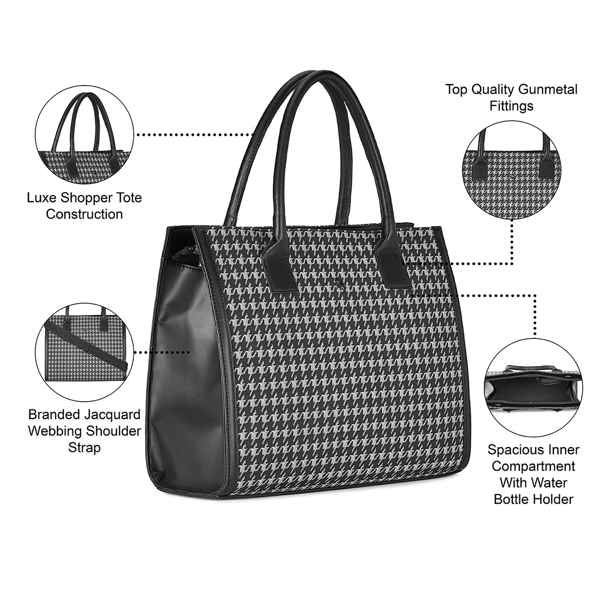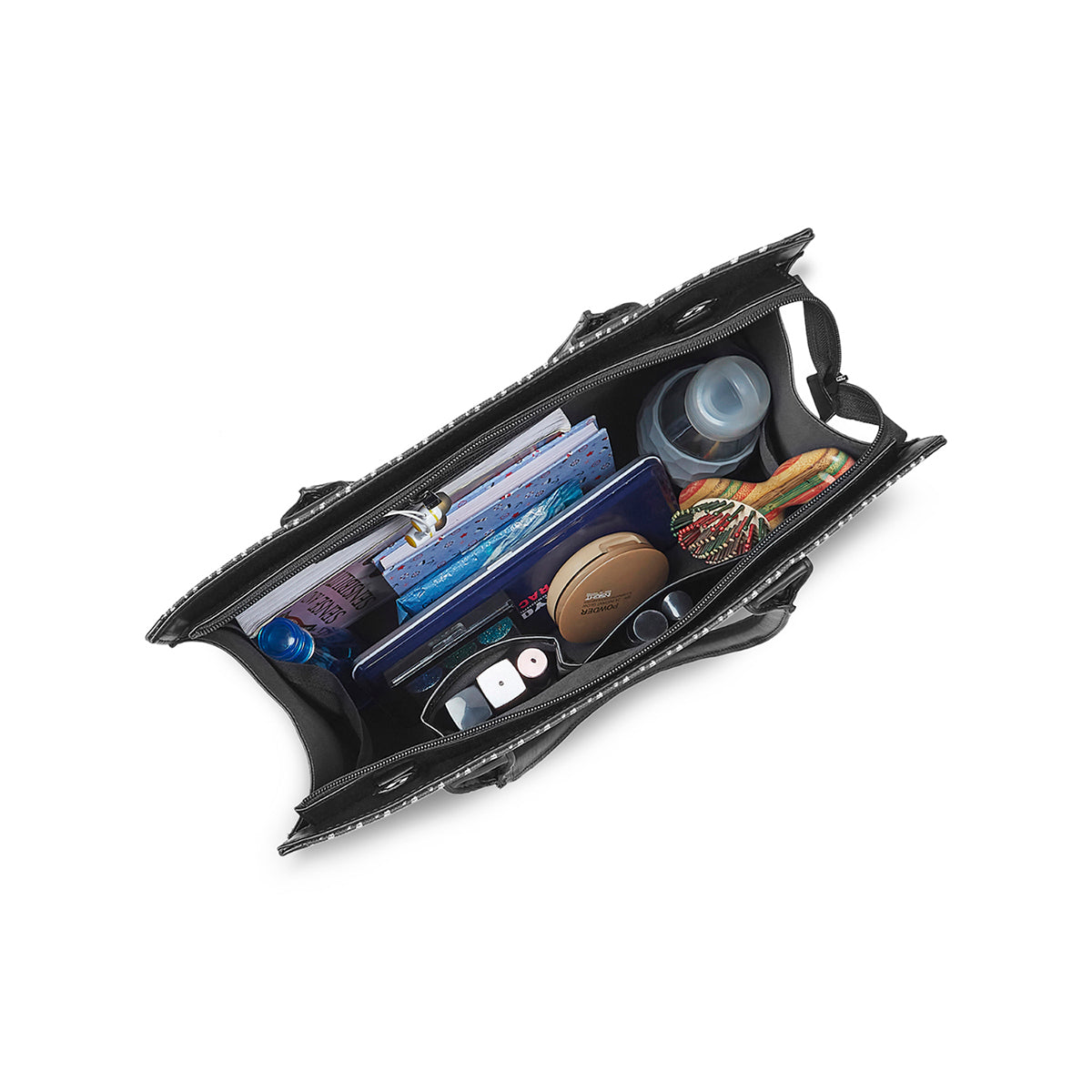 Discover the allure of contrast with the Angelica Shopper Tote by United Colors of Benetton. Showcasing a distinct printed self-pattern, this tote is a blend of contemporary design and timeless elegance. The trim provides an added layer of sophistication, perfectly complementing the tote's secure zipper closure. Crafted from premium PU, the bag's interior boasts a durable polyester twill lining, ensuring longevity. Accentuated with a 15-inch UCB logo and the brand's signature knot emblem, and complemented by dual PU strap handles, the Angelica Shopper Tote stands as a statement of style and elegance, tailored for the discerning woman.