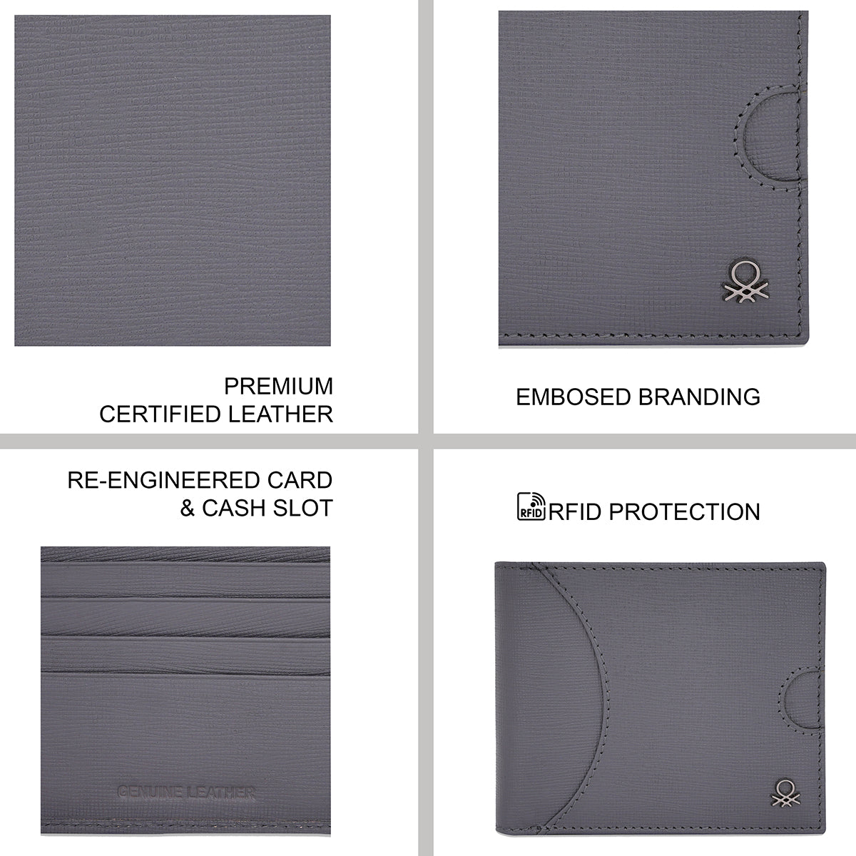 Introducing the Aracel Wallet from United Colors of Benetton, a sophisticated accessory designed for men. Crafted from genuine leather, this global coin wallet features a side closure for security. Its textured pattern and trims add a touch of elegance to its design, complemented by a sleek shiny gunmetal accent. Inside, you'll find two compartments, two pockets, and four card slots, providing ample storage for your essentials. The polyester lining inner material ensures durability, while RFID technology ensures the safety of your personal information. Elevate your style with the Aracel Wallet.