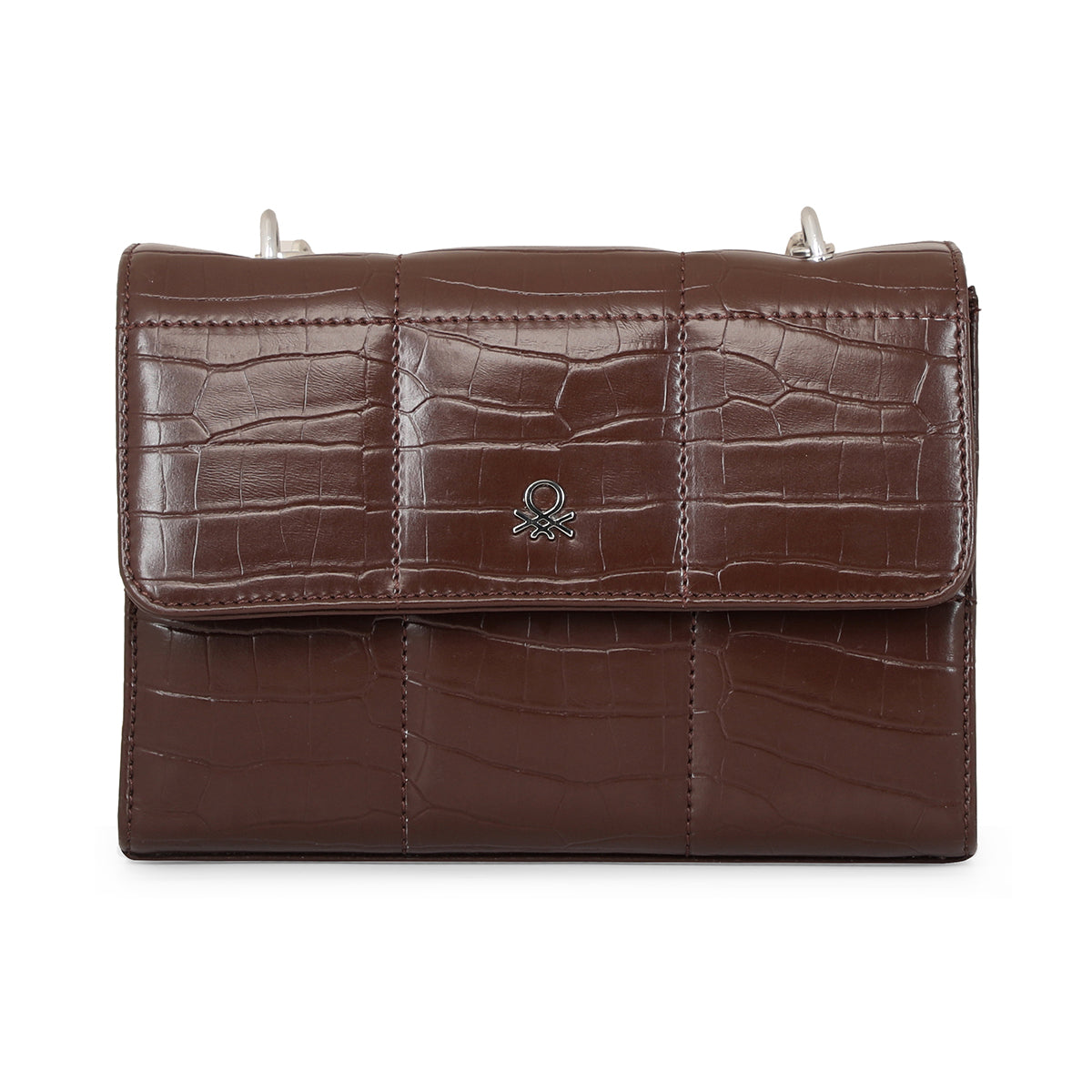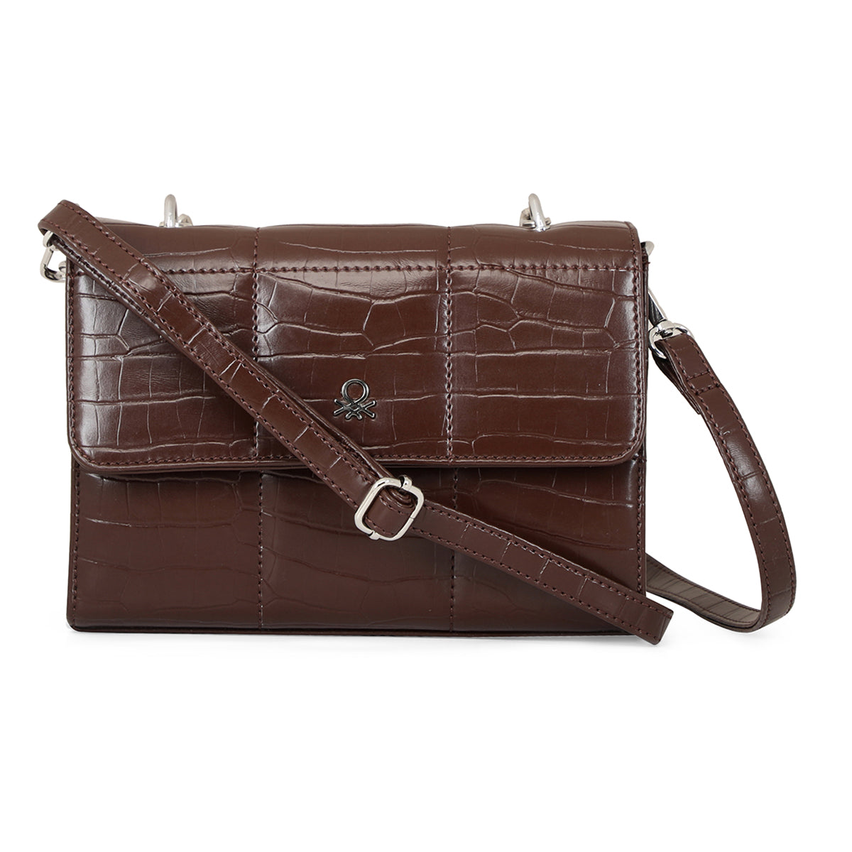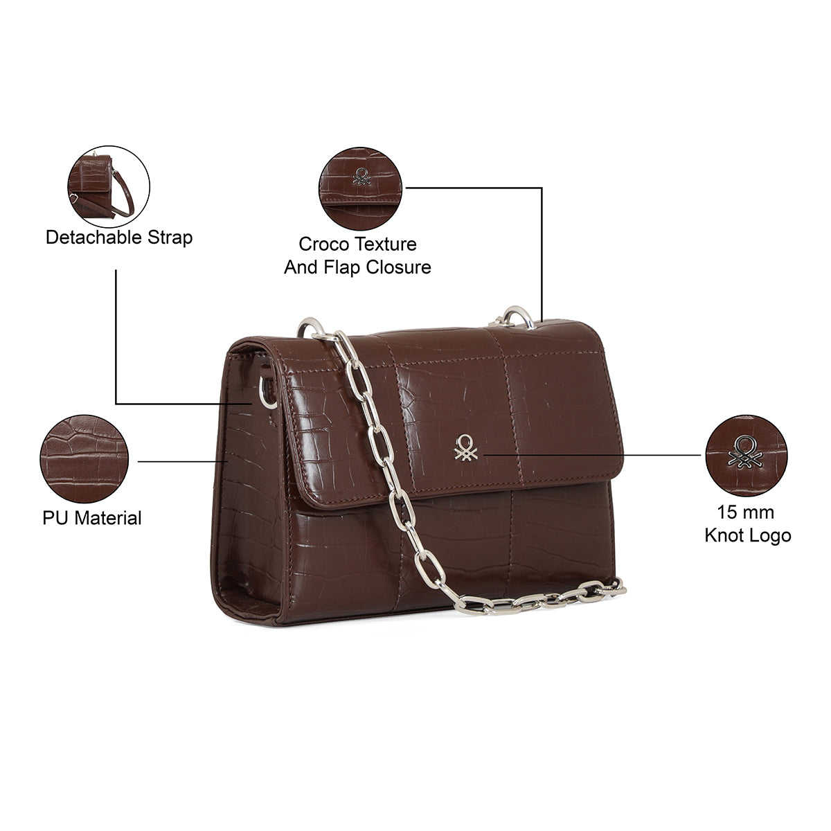 Unveil a touch of elegance with the Candace Sling from the prestigious United Colors of Benetton. This sling bag, with its croco-textured pattern, is a blend of style and functionality. The shiny nickel trim adds a dash of sophistication, while the flap closure ensures your belongings are secure. Crafted from premium PU, the bag's interior, lined with durable polyester twill, features one zip and two inner pockets for organized storage. The detachable PU strap offers versatility in styling. Adorned with a 15-inch UCB logo and a unique knot logo, the Candace Sling is a testament to Benetton's commitment to unparalleled style and quality.