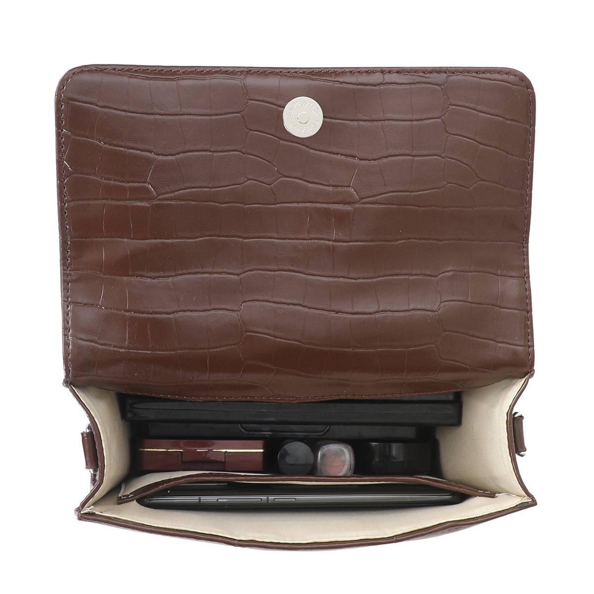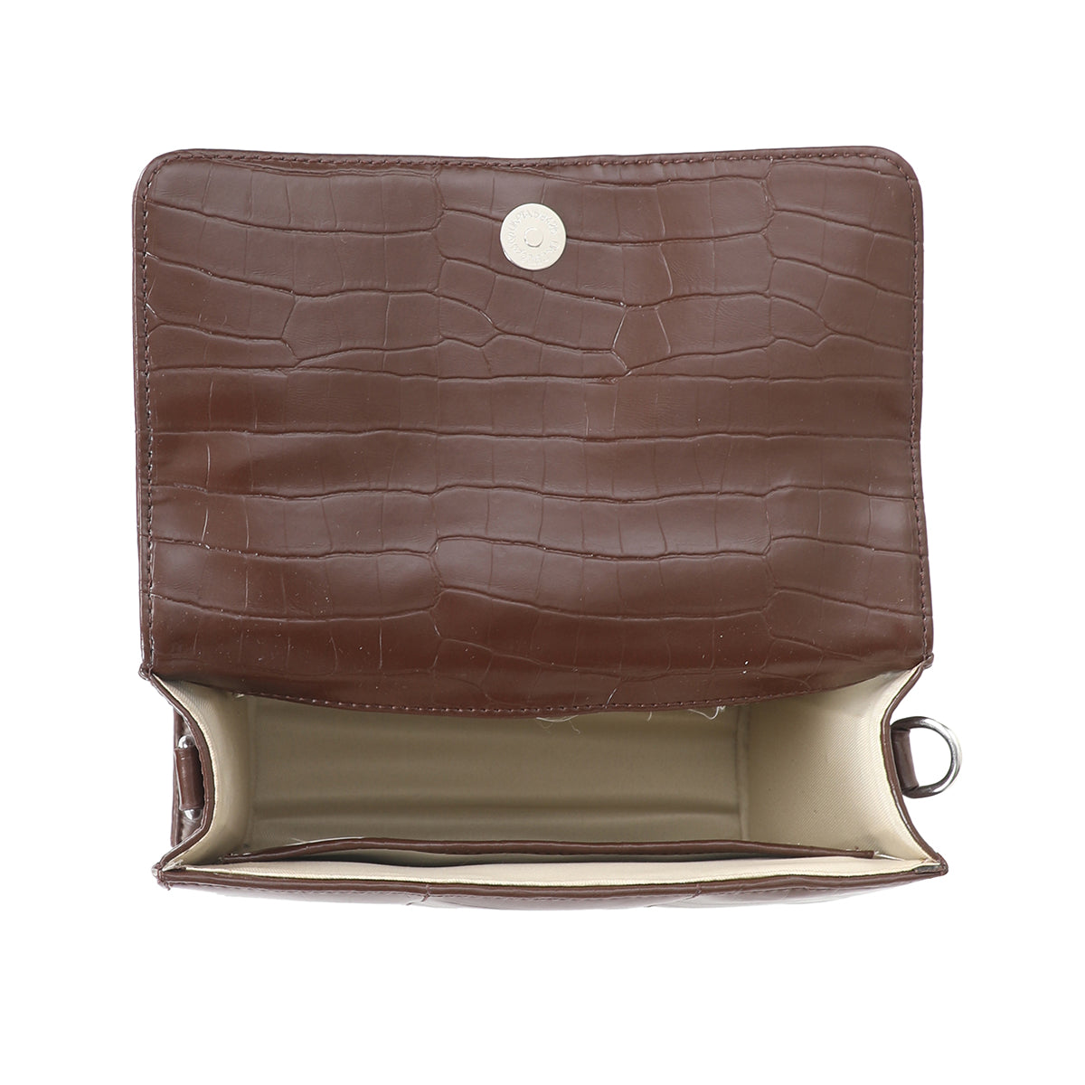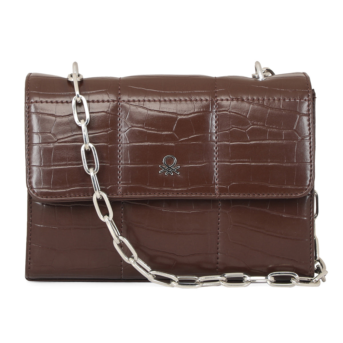 Unveil a touch of elegance with the Candace Sling from the prestigious United Colors of Benetton. This sling bag, with its croco-textured pattern, is a blend of style and functionality. The shiny nickel trim adds a dash of sophistication, while the flap closure ensures your belongings are secure. Crafted from premium PU, the bag's interior, lined with durable polyester twill, features one zip and two inner pockets for organized storage. The detachable PU strap offers versatility in styling. Adorned with a 15-inch UCB logo and a unique knot logo, the Candace Sling is a testament to Benetton's commitment to unparalleled style and quality.