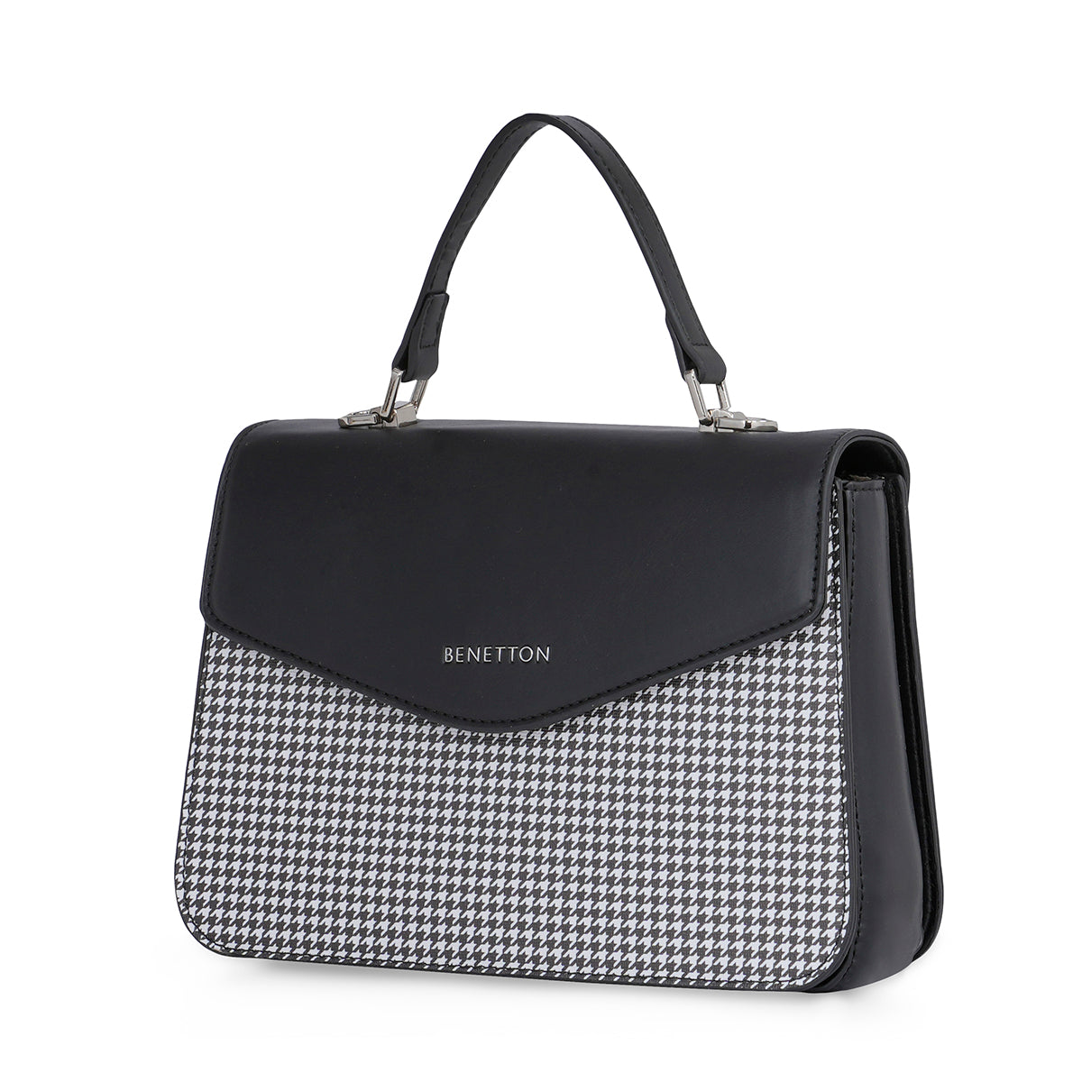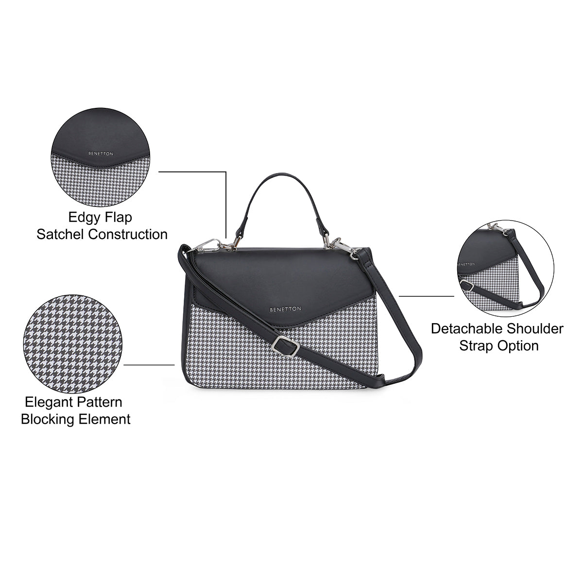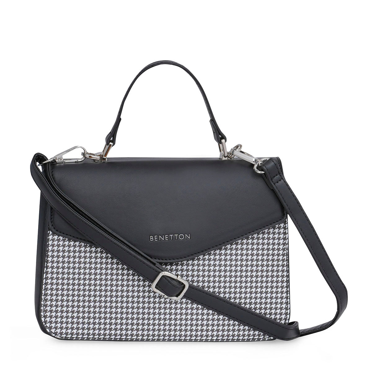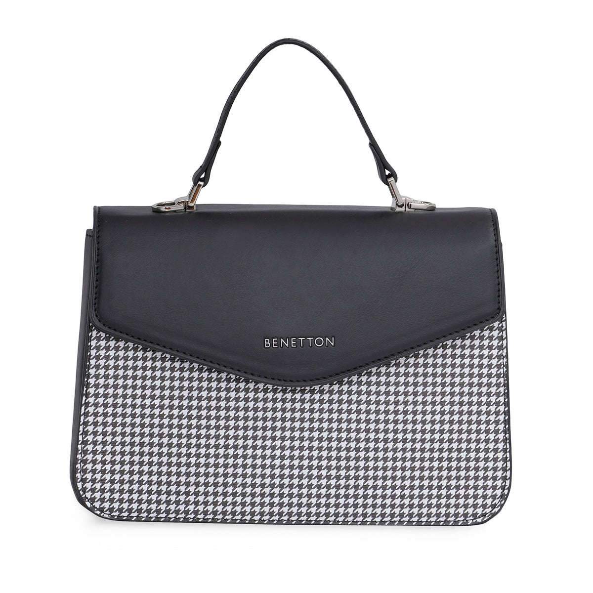 The United Colors of Benetton Caralie Handbag is a chic mini satchel designed for the fashion-conscious woman. Crafted from high-quality PU and lined with cotton, it provides durability and a soft touch. The bag stands out with its elegant houndstooth pattern, adding a classic flair. It features a flap closure and a detachable PU strap, offering versatility in carrying styles. Additionally, the Caralie Handbag has one PU strap handle for easy handling. Inside, it boasts three compartments and one inner pocket, ensuring organized storage for your essentials. Finished with shiny nickel trim, this handbag combines practicality with timeless style, making it a perfect accessory for adding sophistication to any outfit.