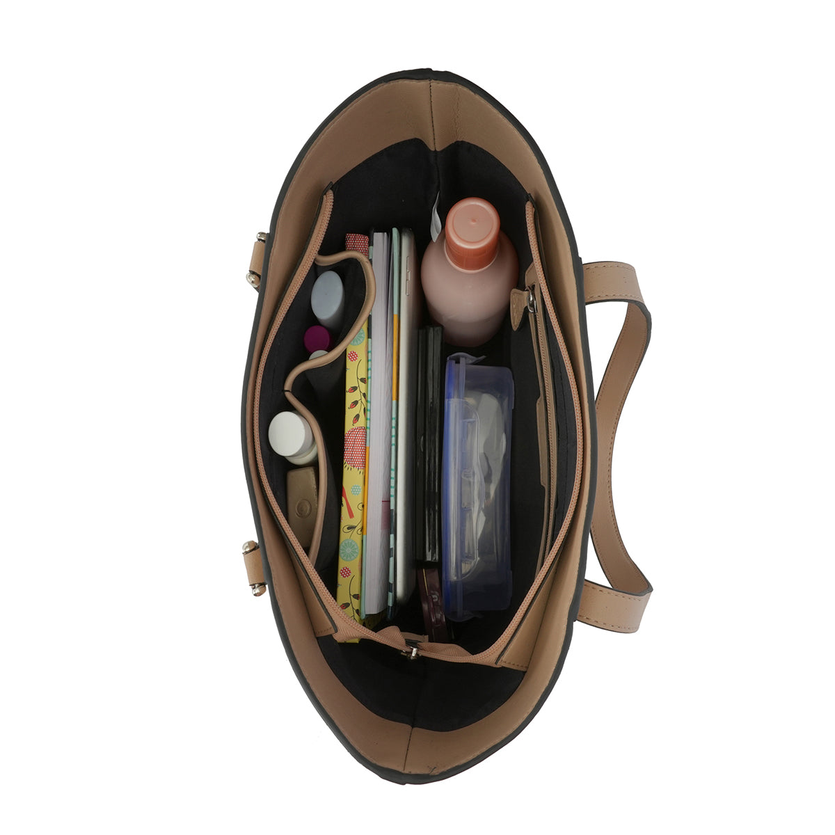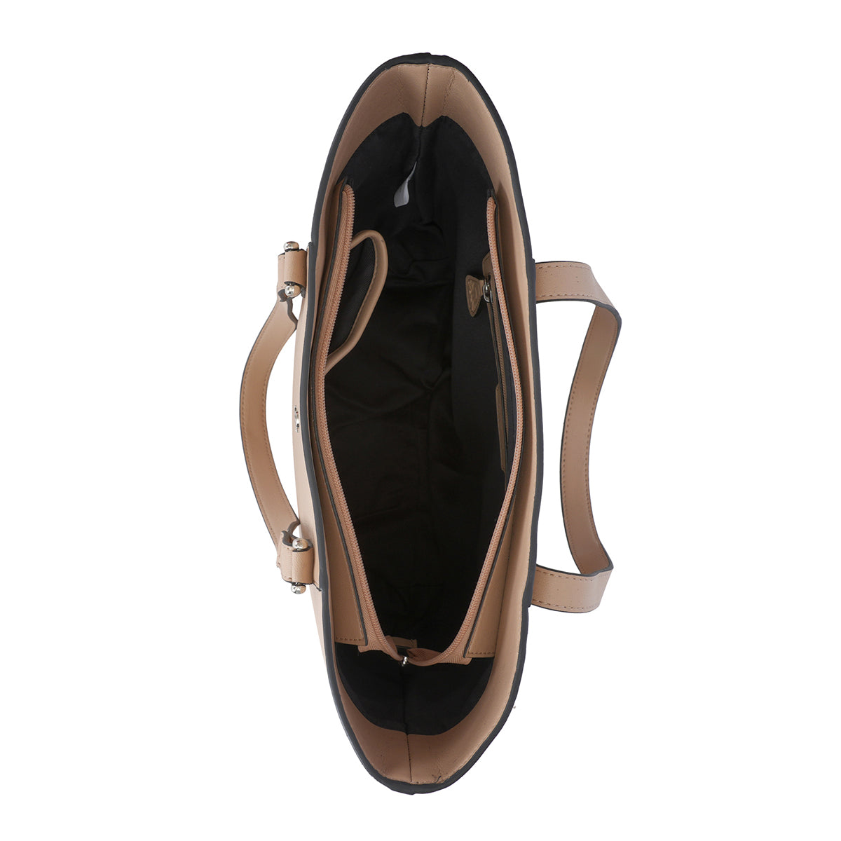 Unveil a touch of modern elegance with the Delphine Tote by United Colors of Benetton. This tote, characterized by its intricate textured pattern, is a harmonious blend of style and utility. The shiny nickel trim infuses a contemporary flair, harmonizing with the tote's secure zipper closure. Inside, the bag's premium PU construction is complemented by a polyester twill lining, featuring two zips and three inner pockets, ensuring your essentials are neatly organized. Adorned with a 15-inch UCB logo and the brand's signature knot emblem, and finished with sturdy PU strap handles, the Delphine Tote is a reflection of Benetton's dedication to craftsmanship and timeless design.