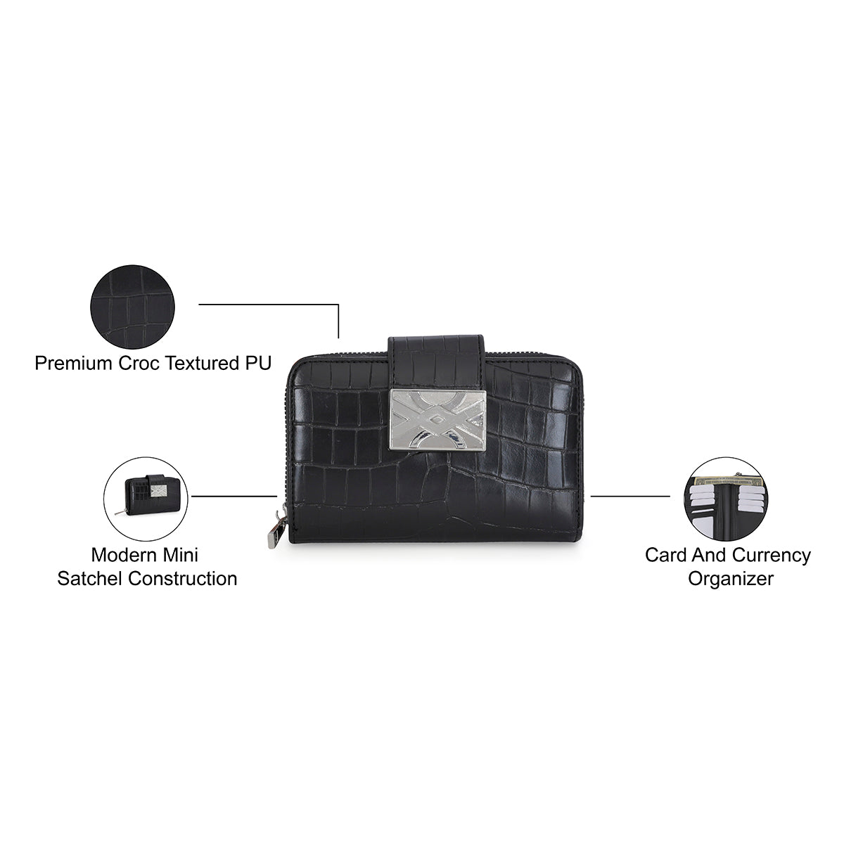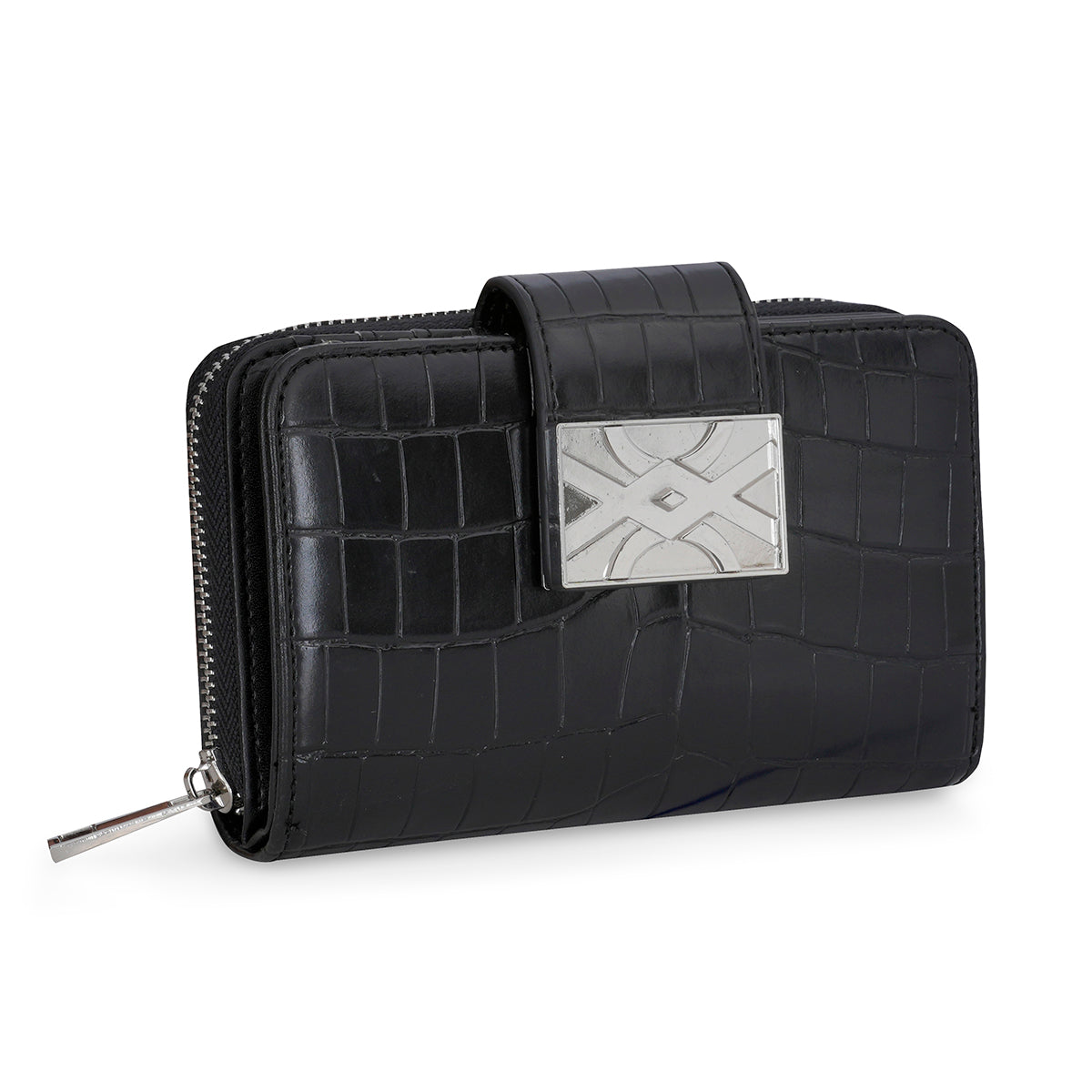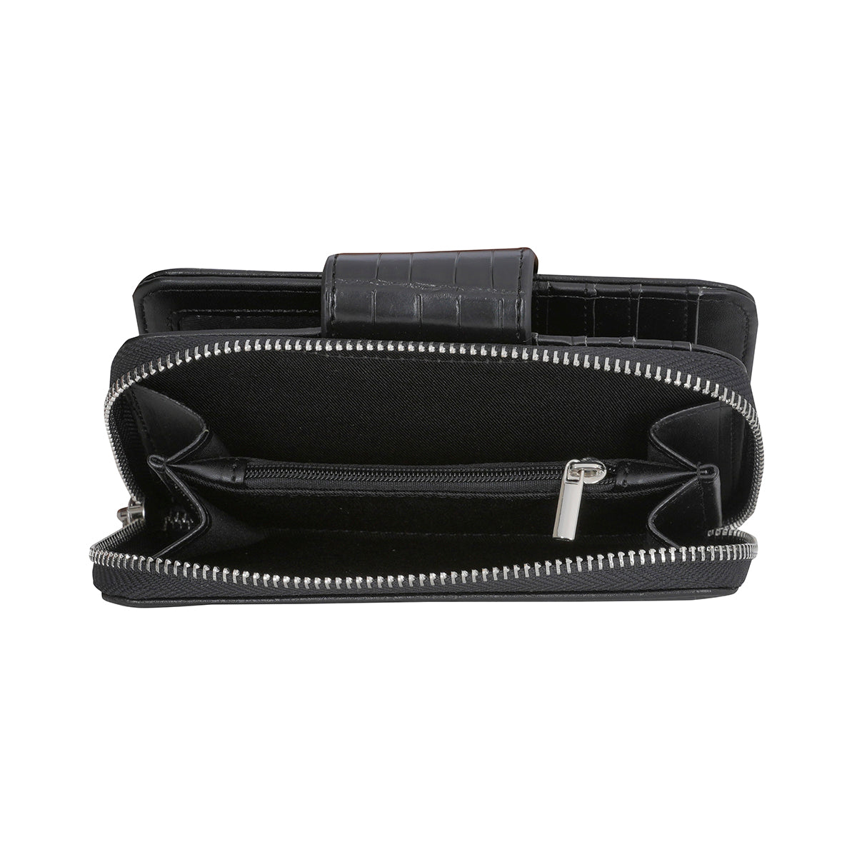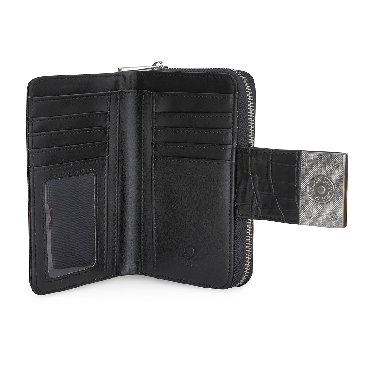 The United Colors of Benetton Skyler wallet is a sleek combination of style and organization. Made from durable PU material and a cotton lining this wallet features a captivating croc-textured pattern. With two compartments, eight pockets, and eight card slots, the Skyler Wallet provides ample storage for your belongings while the zipper closure ensures the safety of your essentials.. The shiny nickel trim adds a modern edge, and the flap closure for securing cards adds an extra layer of convenience. Elevate your accessory collection with this chic and functional wallet that seamlessly blends fashion with practicality.